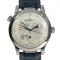 Beautiful Jaeger-LeCoultre Master Geographic in steel on new blue generic leather trap, steel folding clasp
