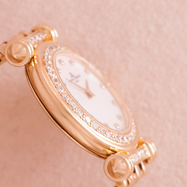 Het horlge heeft een parelmoeren wijzerplaat met diamanten index en is origineel bezet met briljanten op de lunette.