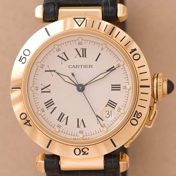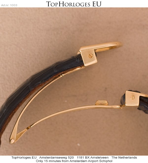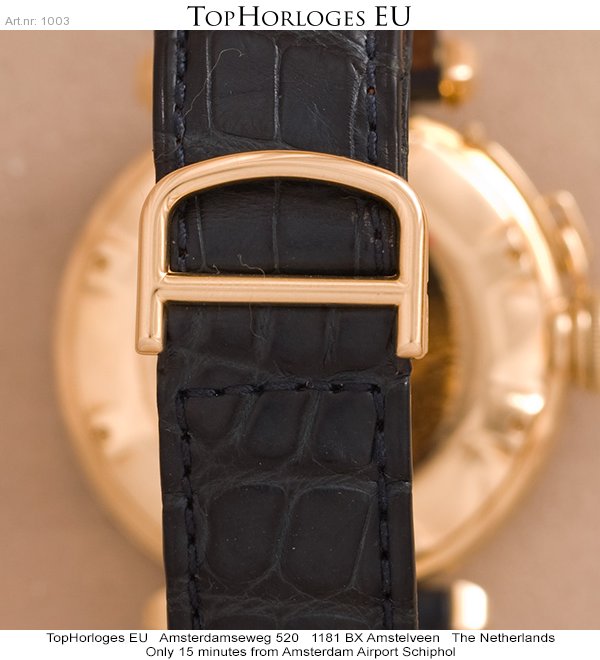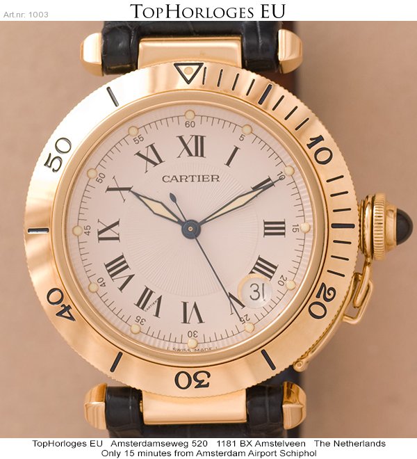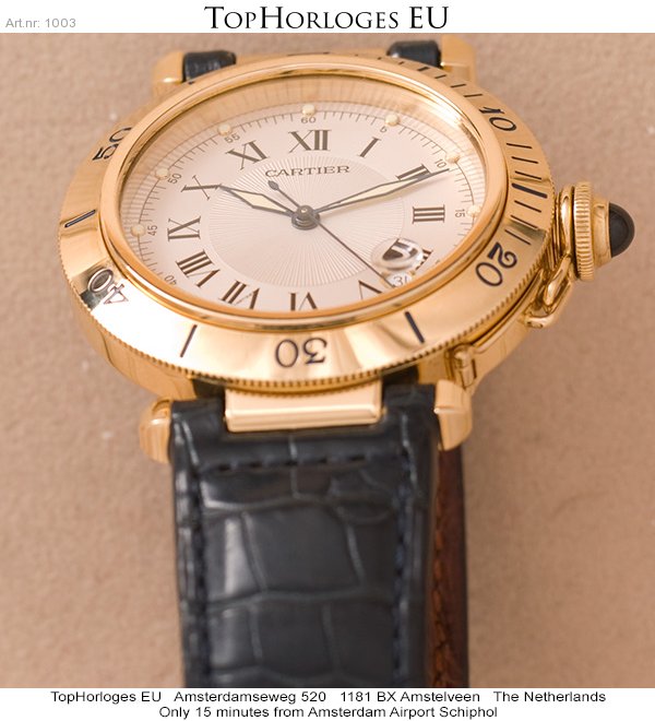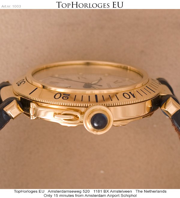 Mooie gouden Cartier Pasha 38mm blauwe leren croco band met gouden vouwsluiting.