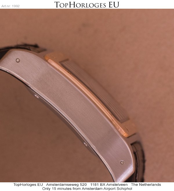 En zo goed als ongedragen Santos 100 medium model in het staal met rozegouden lunette.