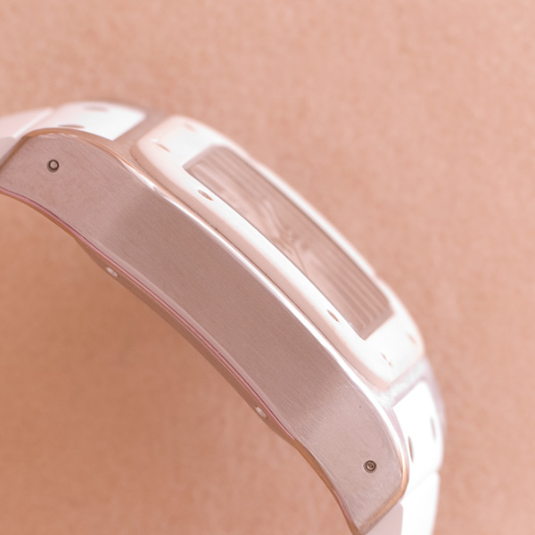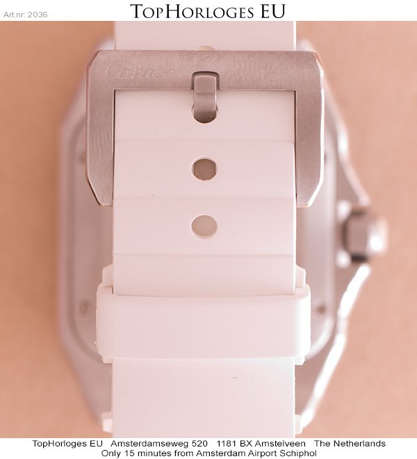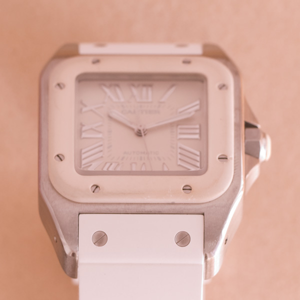 Een weinig gedragen stalen dames Cartier Santos 100 PM met witte rubberen lunette en band.