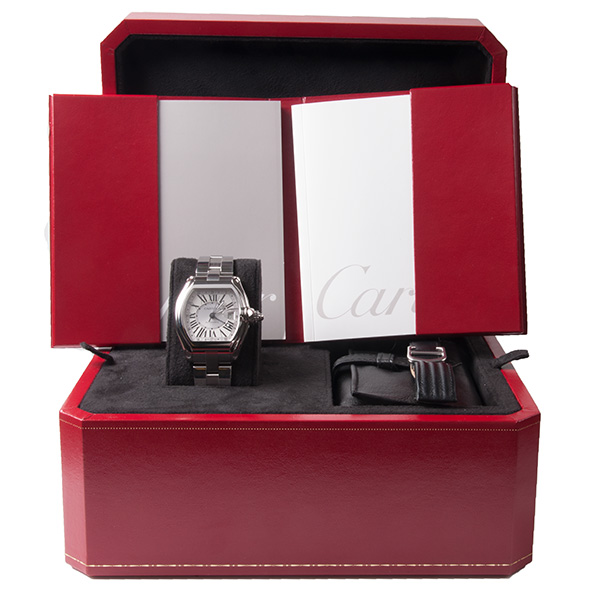 Een weinig gedragen stalen Cartier Roadster GMT met stalen band. Geheel kompleet met doos, papieren en zwarte leren band met stalen vouwsluiting.