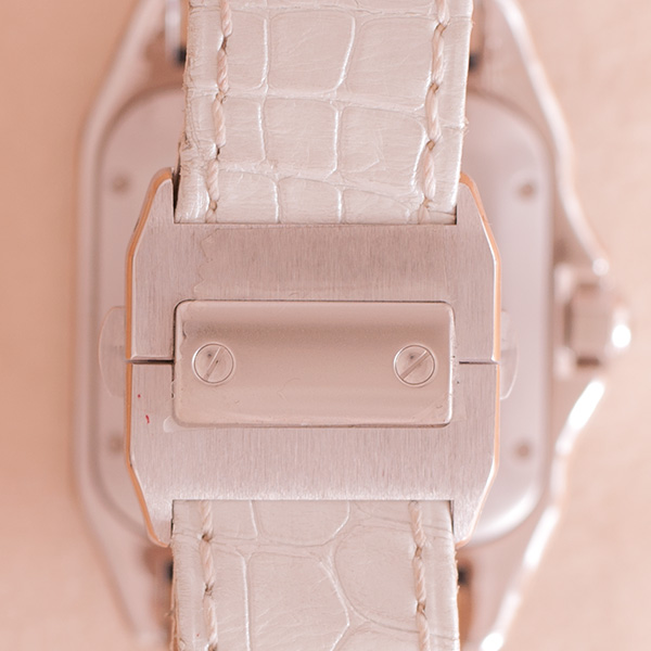 Een nieuwe Cartier Santos MM in het witgoud met parelmoeren wijzerplaat en band en witgouden vouwsluiting.