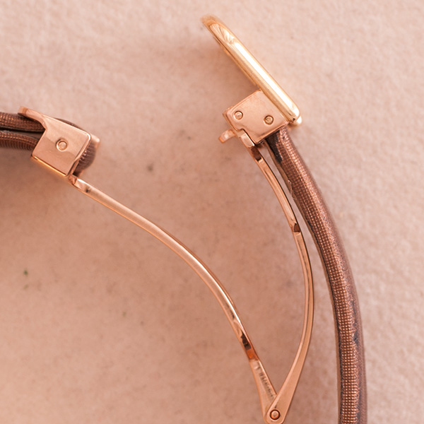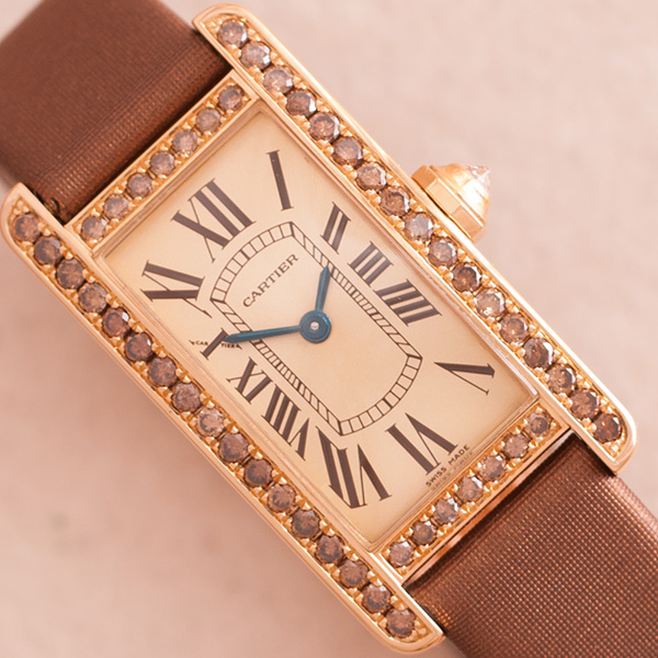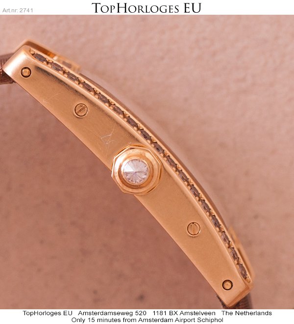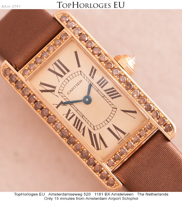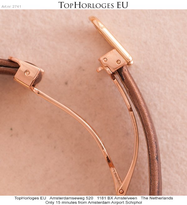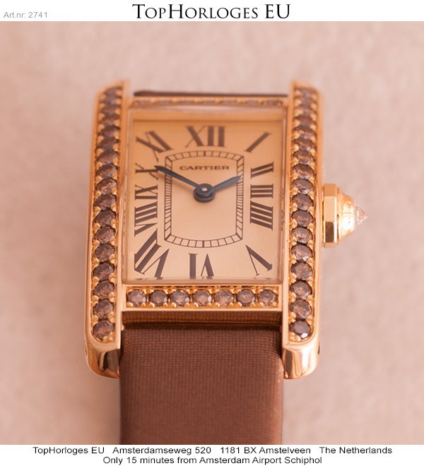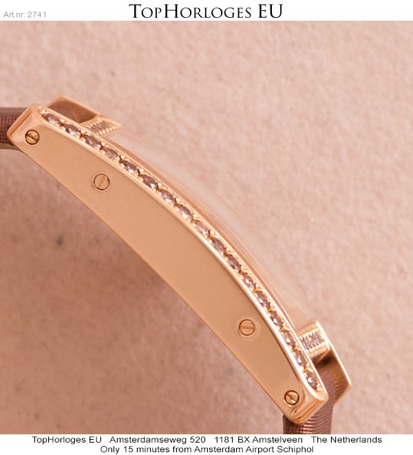 Deze Boutique uitvoering is door de fabriek origineel voorzien van natuurlijke Champagne / Cognac kleurige diamanten en een goudkleurige wijzerplaat in combinatie met een bruin satijnen horloge band en gouden vouwsluiting.