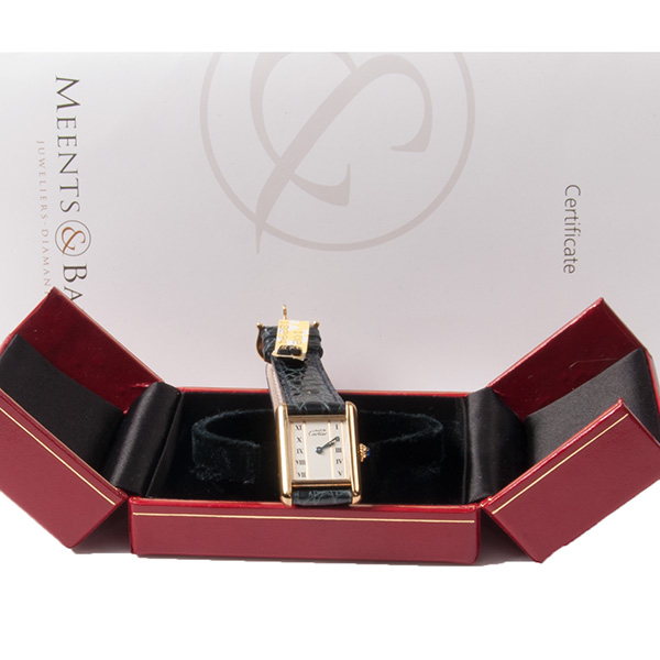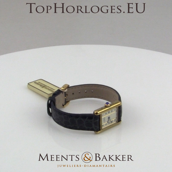 Een weinig gedragen Cartier dames Tank horloge. Voorzien van een nieuwe leren Cartier band. Goud op zilver met lederen band en doornsluiting. Luxe doos, certificaat en 12 maanden garantie.