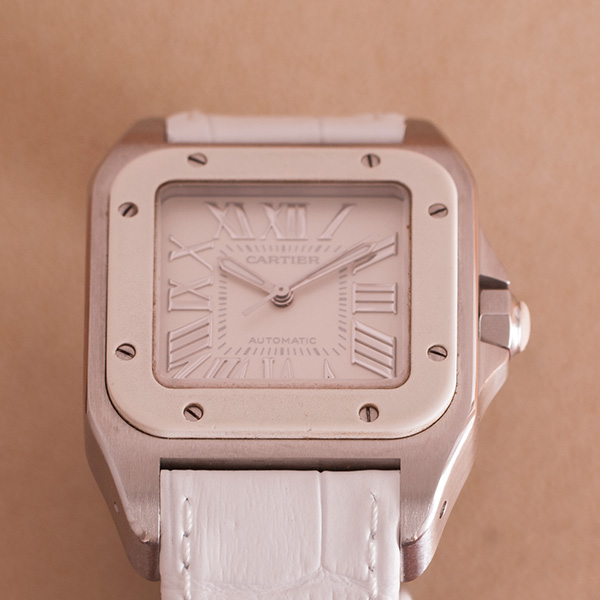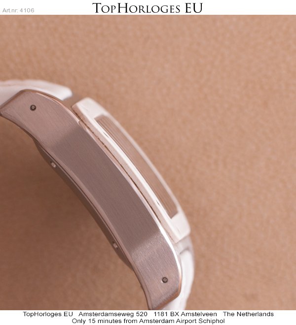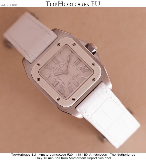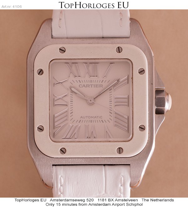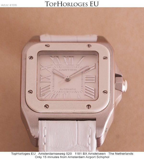 Een mooie, weinig gedragen cartier Santos 100 Medium Model in het staal met wit rubberen lunette. Het horloge is voorzien van een nieuwe witte, generieke lederen band en wordt geleverd in de originele doos.