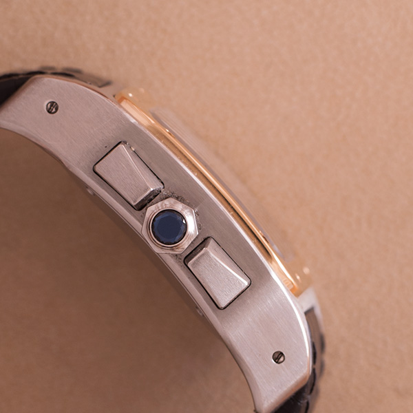 Very nice, steel and gold Cartier Santos 100 Chronograph with new black leather strap. This desireble full size version comes with the box and the papers. ( 2008 NL )