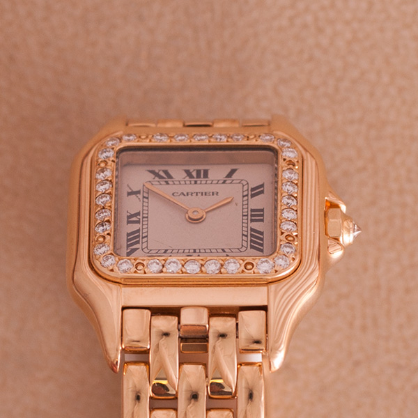 Zeer mooie, gouden dames Cartier Panthere. Deze uitvoering is in een pracht staat. Door Cartier origineel voorzien van een diamanten lunette en kroontje.