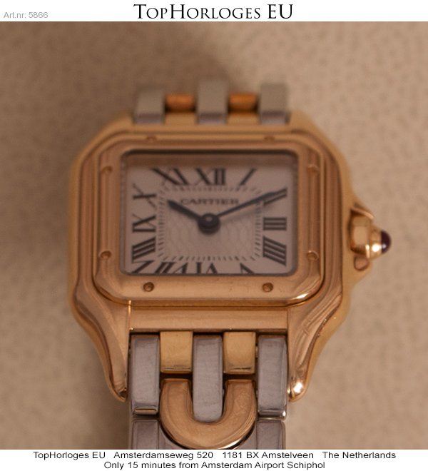 Een prachtige dames Cartier Panthere Art Deco uitvoering. Dit gelimiteerde model met een robijnen kroontje (1847 stuks gemaakt ter ere van het 150 jarig bestaan) is geheel geserviced door Cartier (12/2018)