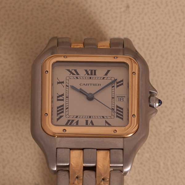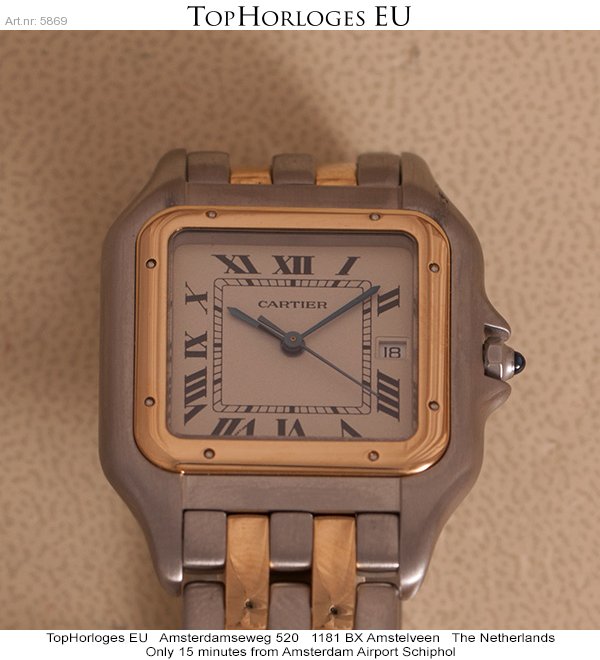 Een groot model Cartier Panthere met de datum op 3 uur, in het staal met 2 rijen goud. Dit horloge is in een uitstekende staat en komt met het originele garantieboekje, een luxe doos en een certificaat met 12 maanden garantie van onze winkel.