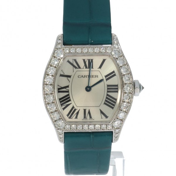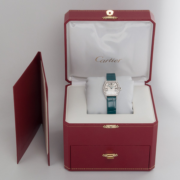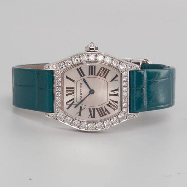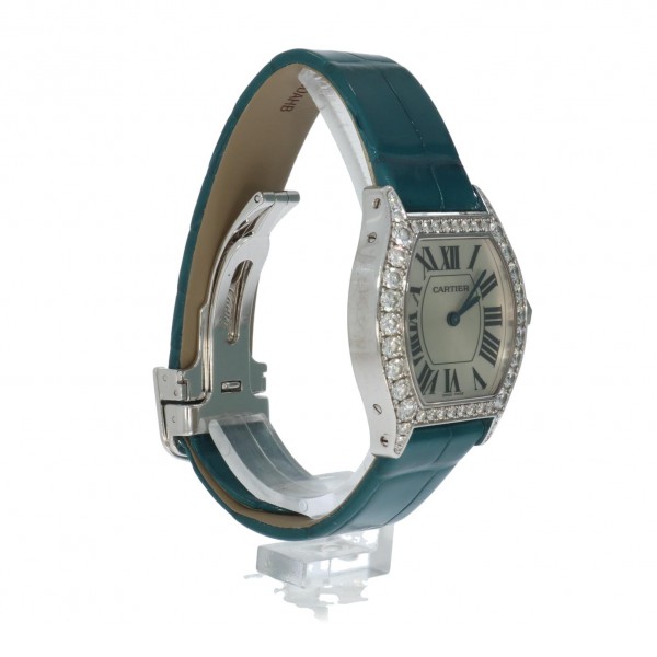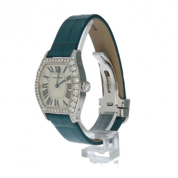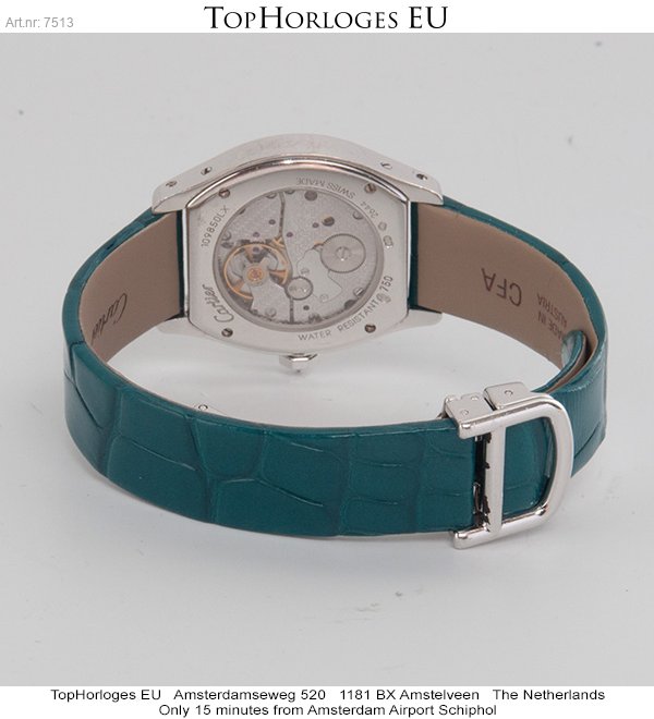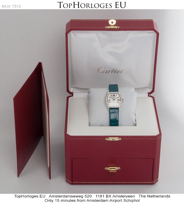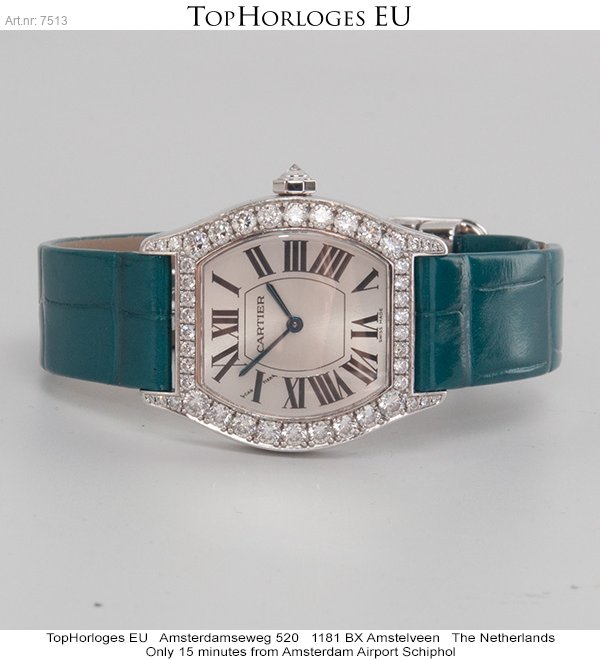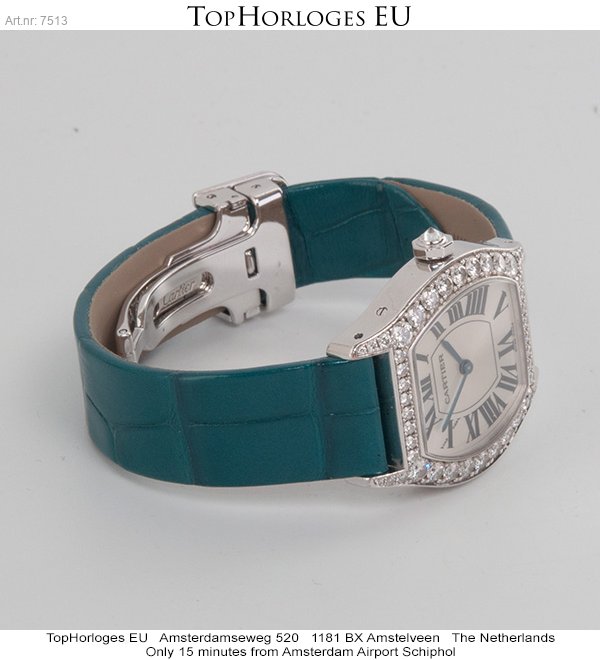 Een zeer mooie dames Cartier in het witgoud met lederen band en witgouden vouwsluiting. Dit Tortue model is origineel bezet met briljant geslepen diamanten.