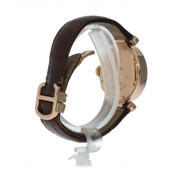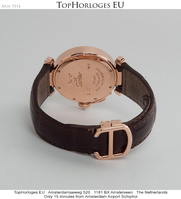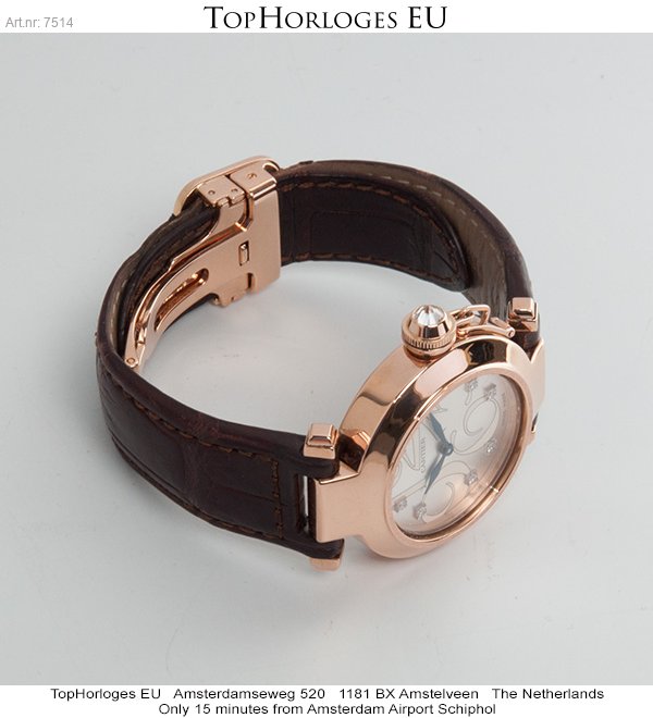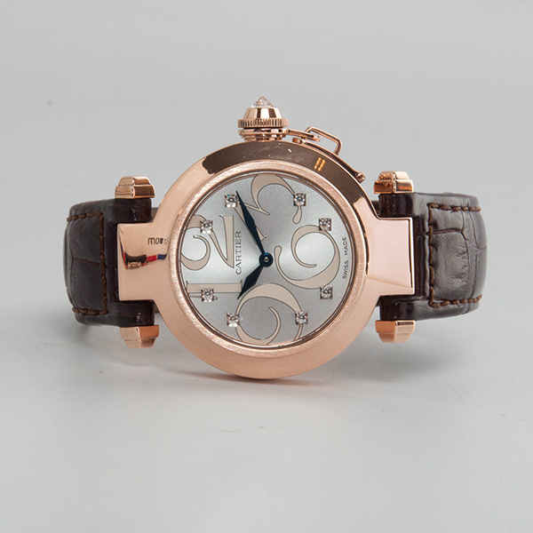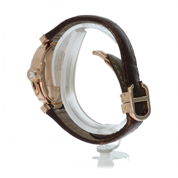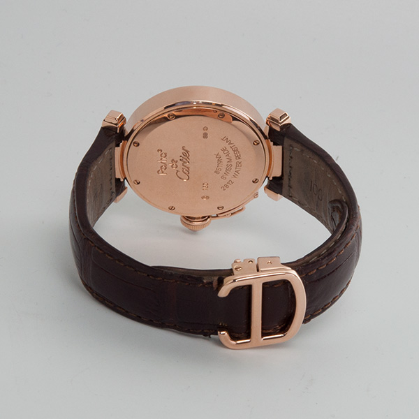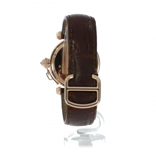 Een weinig voorkomende Cartier Pasha in het rozegoud met lederen band en vouwsluiting.