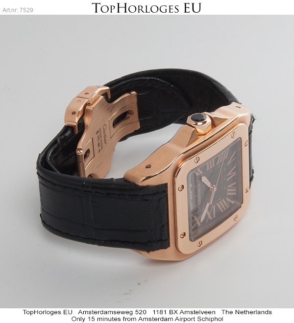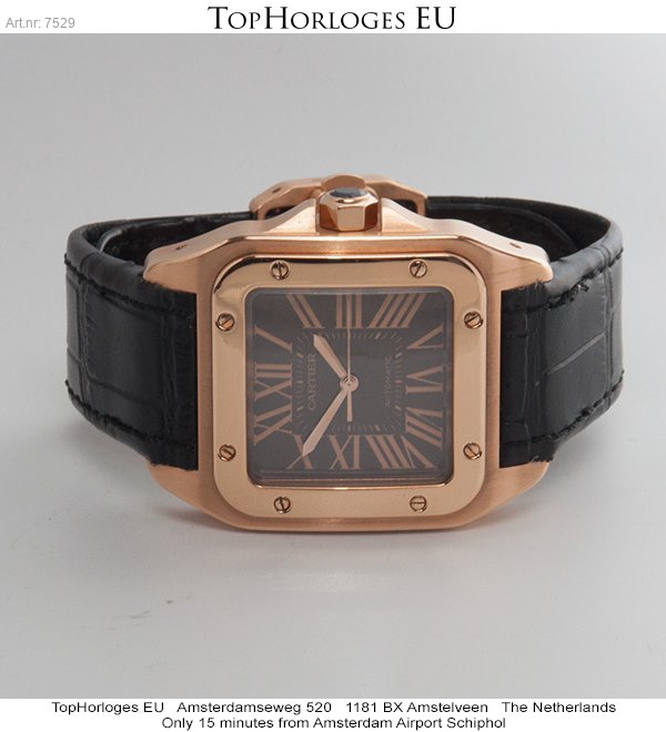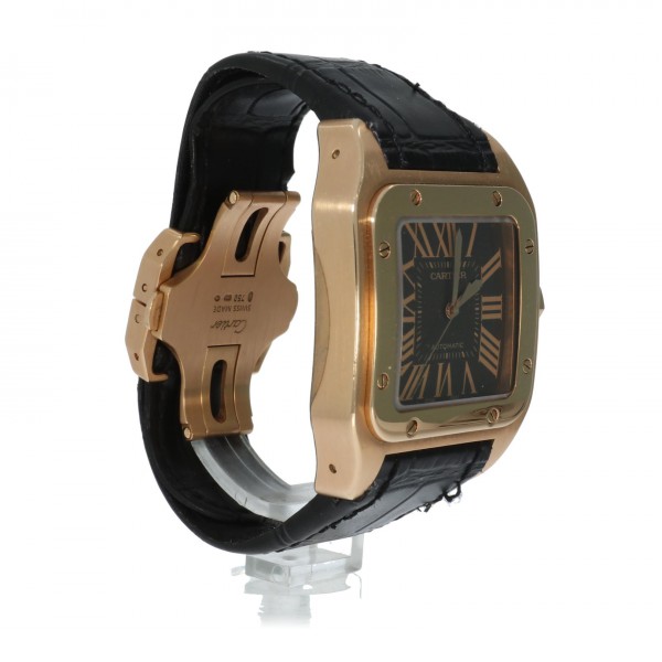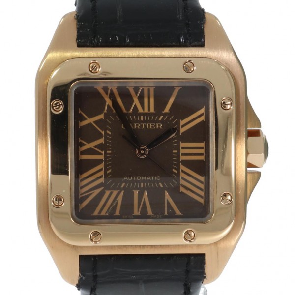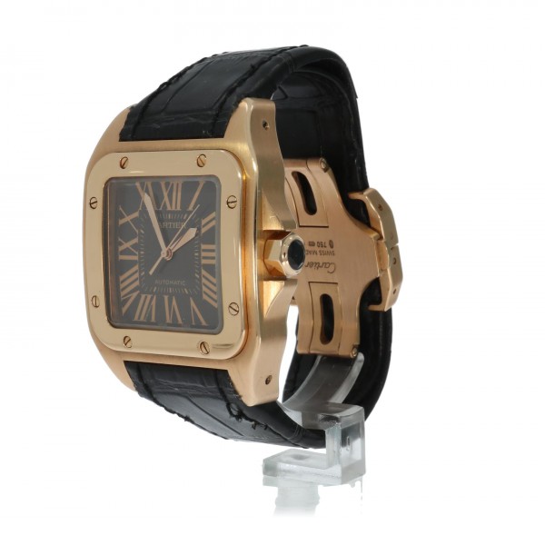 Een ongedragen Cartier Santos 100 XL in het rozegoud met 'chocolate' bruine wijzerplaat.