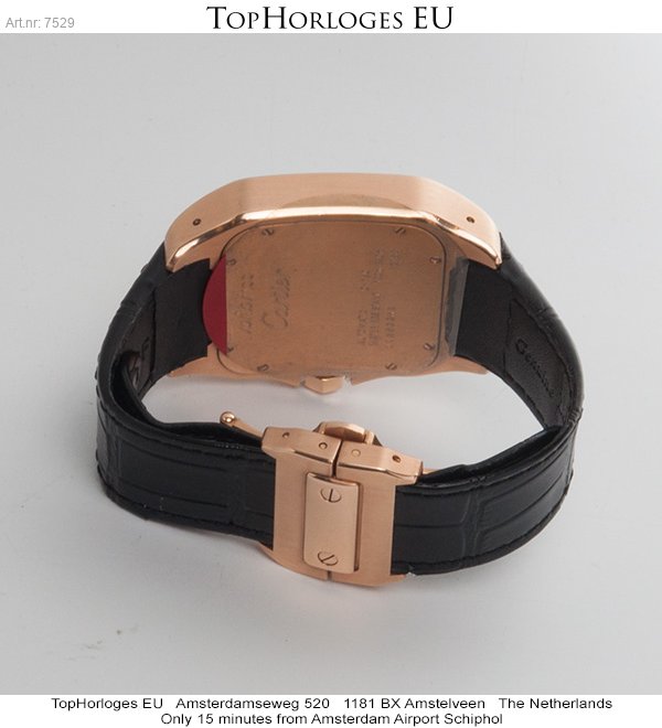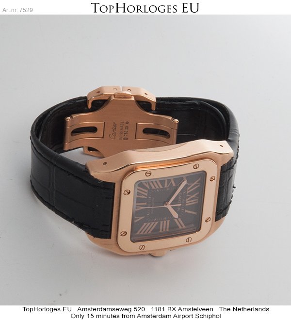 Unworn Cartier Santos 100 XL in rosegold on black leather strap and folding clasp.