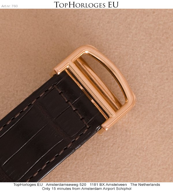 Het 42mm grote roségouden horloge is voorzien van een donker bruine crocoband en een roségouden vouwsluiting.