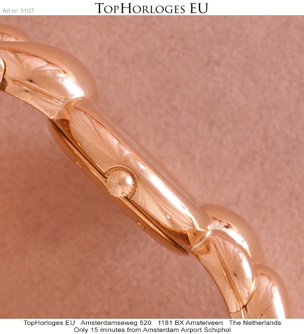 Geheel 18 karaats geelgoud met parelmoeren wijzerplaat en diamanten uuraanduidingen.