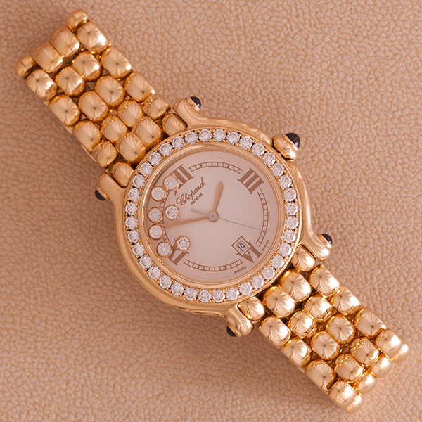 Barely worn big model Chopard Happy Sport in yellow gold with 7 moving diamonds and a diamond mounted bezel.