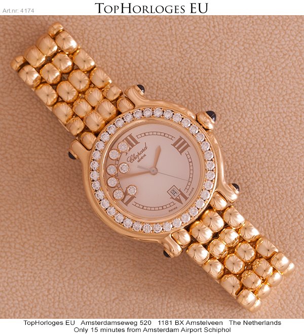 Een zeer weinig gedragen Chopard Happy Sport in het goud met gouden band en een met briljant bezette lunette, groot model