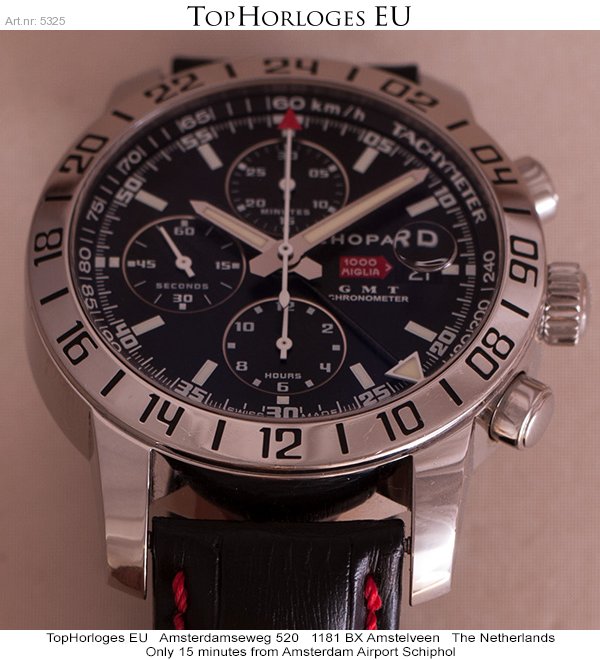 Een zo goed als ongedragen Chopard Mille Miglia. Het betreft een GMT versie in het staal met zwart lederen band. Compleet met alle bijbehoren, doos, garantiecertificaat en boekjes.