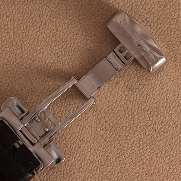 Stalen kast, donker blauwe wijzerplaat en lederen band met vouwsluiting.