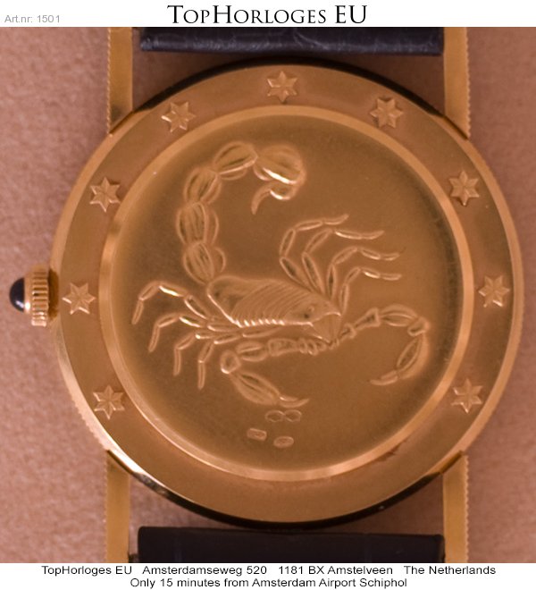 Op de wijzerplaat zijn de sterrenbeelden afgebeeld en op de deksel een schorpioen.