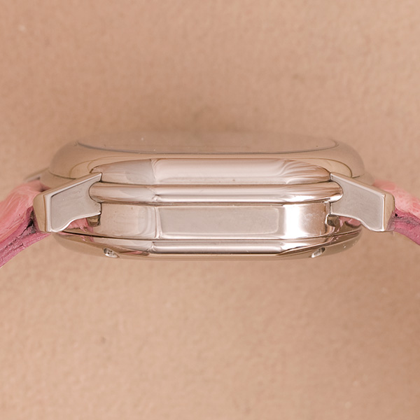 Een nieuwe Daniel roth chronograaf voor dames. Stalen kast met glazen deksel waardoor het automatische uurwerk zichtbaar is. Roze croco-lederen horlogeband met stalen gesp.