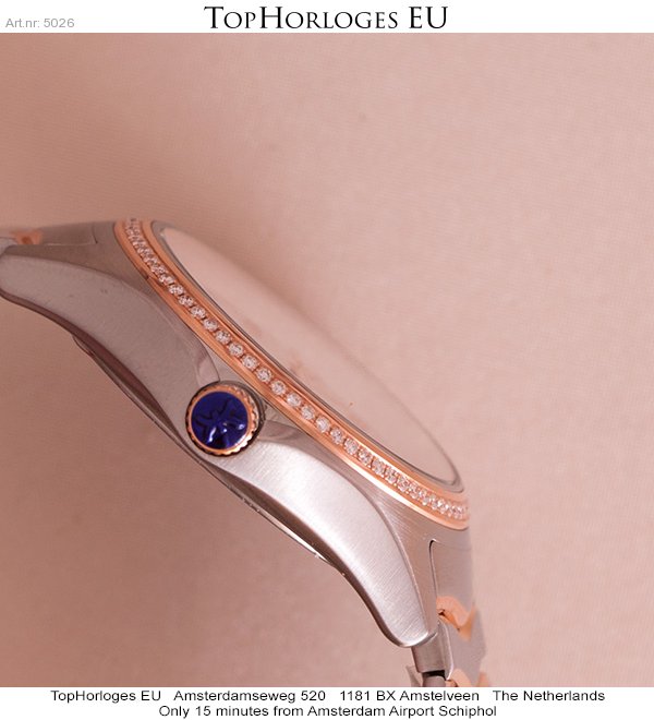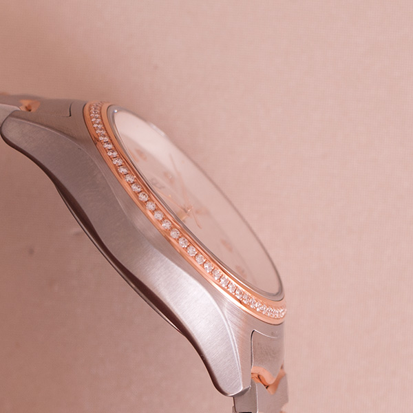 Deze 35mm dames uitvoering is in het rozegoud met staal, ivoorkleurige wijzerplaat met diamanten index en een met briljant bezette lunette.