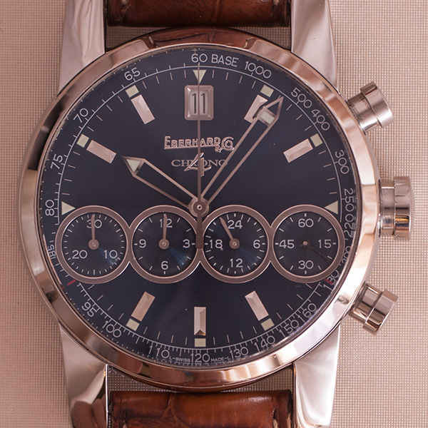 Very nice and clean Eberhard & Co Chrono 4 . This steel version is in an overall very good condition. Brown leather strap with pinbuckle and extra folding clasp.