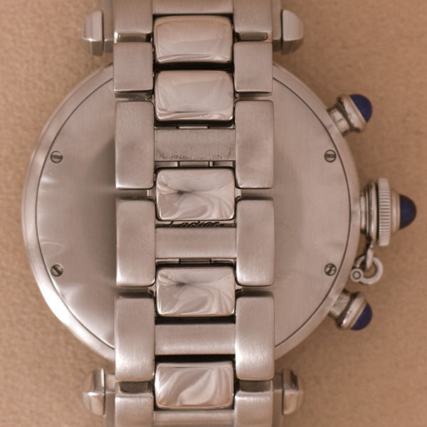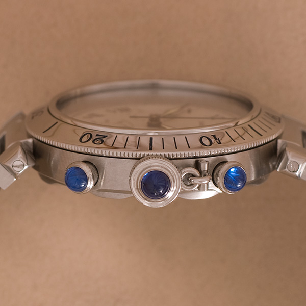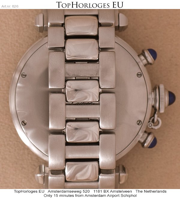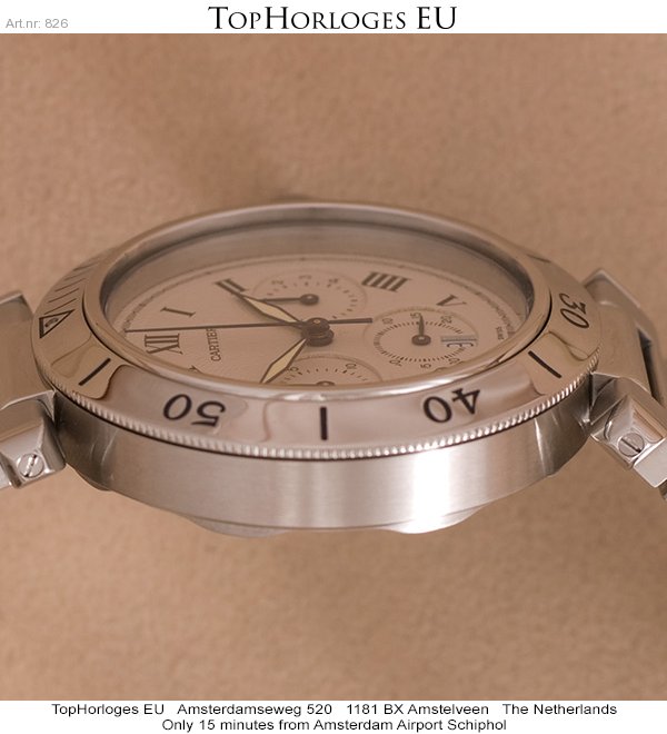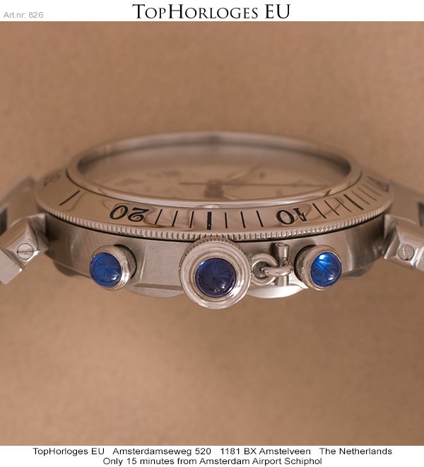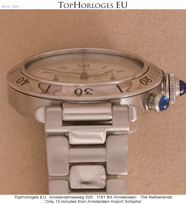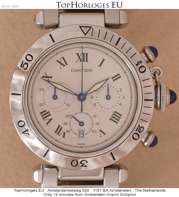 Een stalen Cartier Pasha 38mm met stalen band. Quartz uurwerk met chronograaf en datum.
