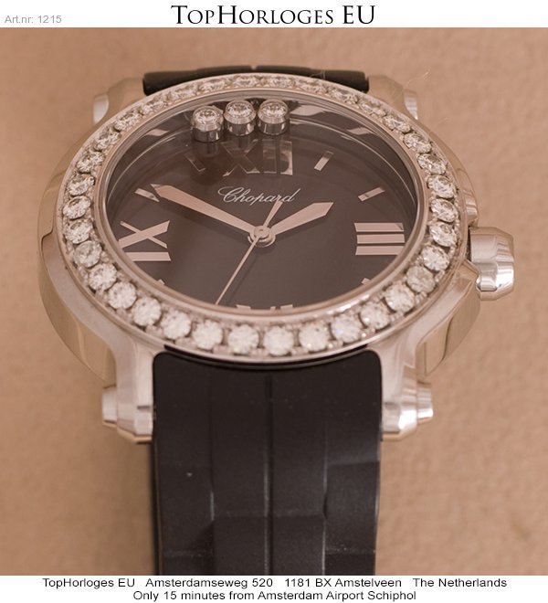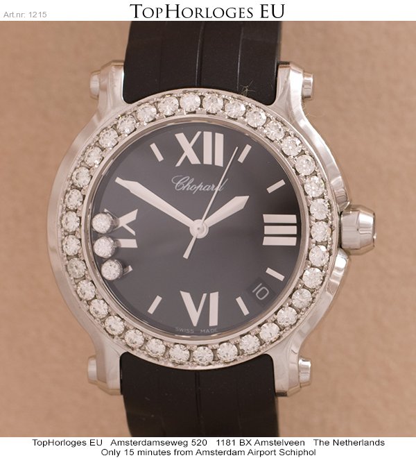 Een zogoed als nieuwe stalen Chopard Happy Sport. Zwarte rubber band met stalen gesp. Zwarte wijzerplaat met 3 losse briljanten. Lunette later bezet met briljant.