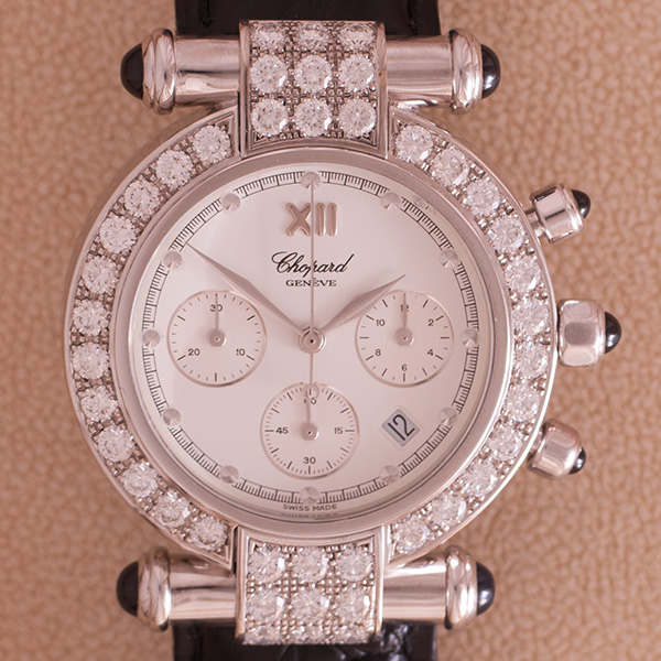 This big model Chronograph with date is original fabric mounted with diamonds.