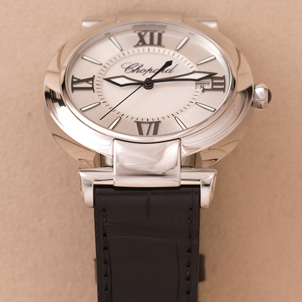 De nieuwste stalen Chopard Imperiale met zwarte leren croco band met stalen gesp sluiting. Automaat en datum functie.