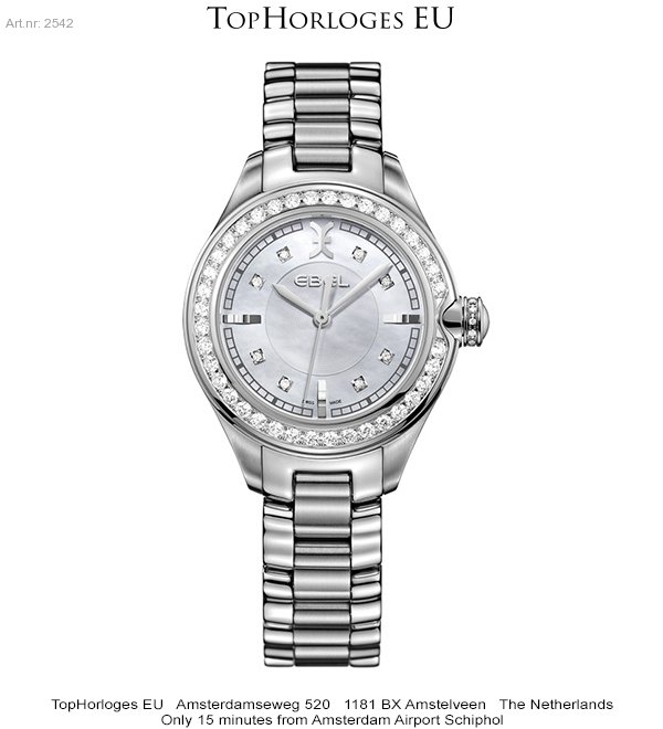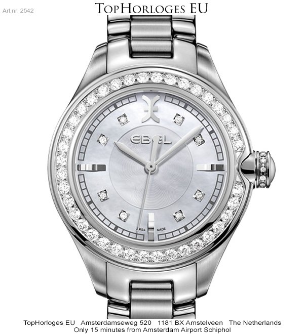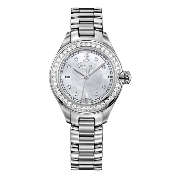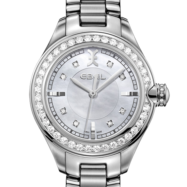 Women's EBEL Onde watch, 30.0 mm brushed and polished stainless steel case with 38-diamond stainless steel bezel and 12-diamond crown, white mother-of-pearl dial with applied indexes and diamond markers, brushed and polished stainless steel link bracelet with deployment clasp, Swiss quartz movement, double-sided antireflective sapphire crystal, water resistant to 50 meters.