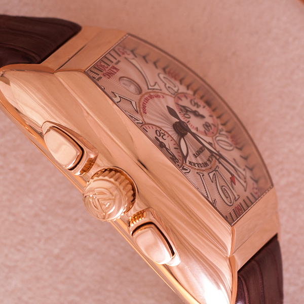 Een zeer mooie rozegouden Franck Muller King Conquistador Chronograaf met lederen band en gouden vouwsluiting.