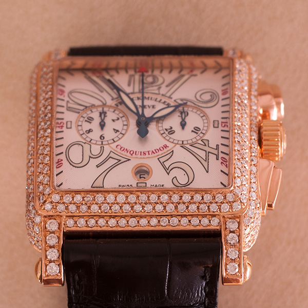 Een in nieuwstaat verkerende roze gouden Franck Muller Conquistador Cortez Chronograaf.
