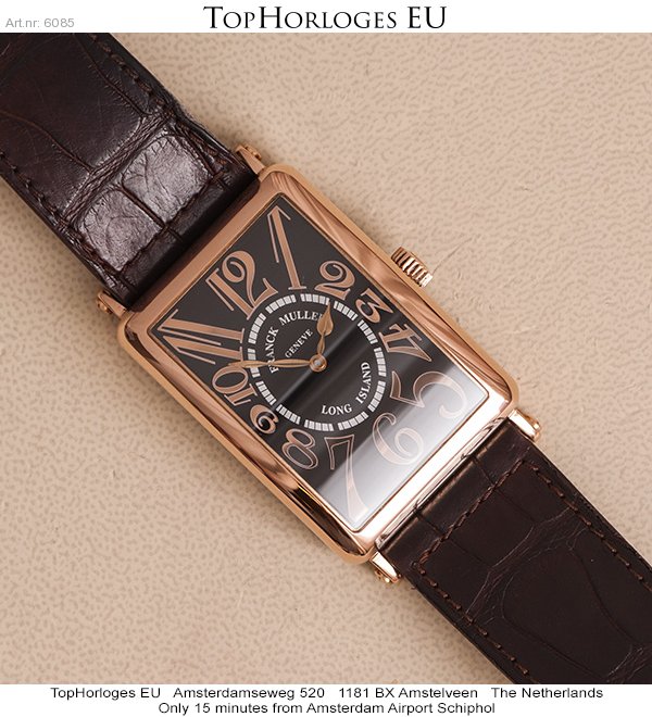 A stunning 18k rosegolden Franck Muller Long Island, Large Model with black dial and rosegolden index. Dark brown leather strap with rosegolden buckle.