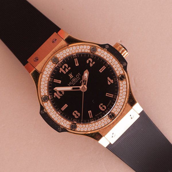 Barely worn Hublot Big Bang in 18 rosegold with black rubber strap. Bezel original fabric mounted with diamonds.