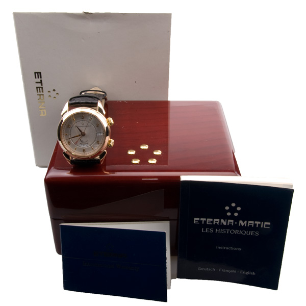 Een zeer weing voorkomende Eterna Matic Reveil uitvoering. Het is een in 1998 uitgegeven remake uit de Les Historiques serie t.g.v. het 50 jarige jubileum in het rozégoud.
