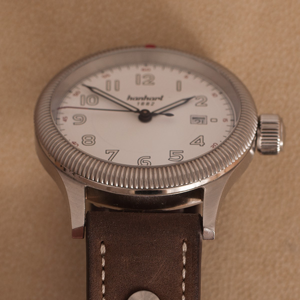 Een zo goed als ongedragen Hanhart Pioneer One met witte wijzerplaat en bruine lederen band