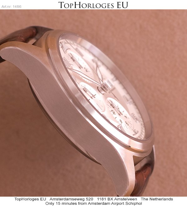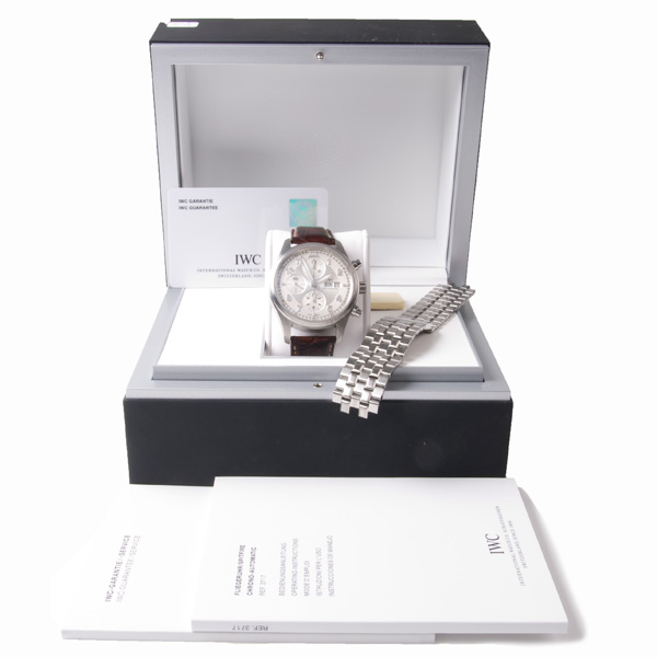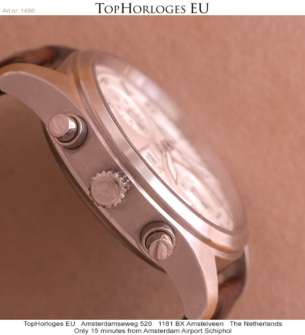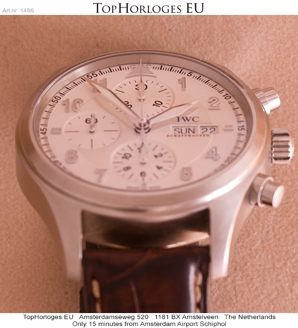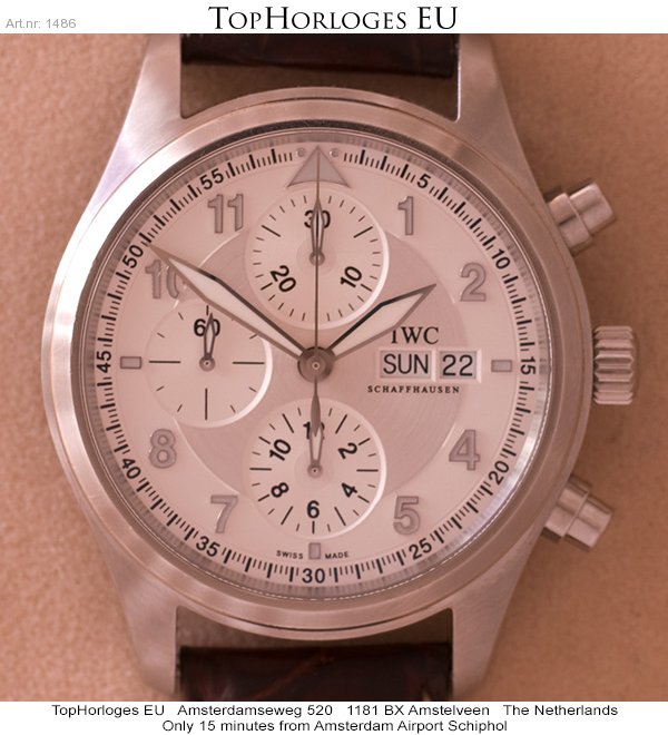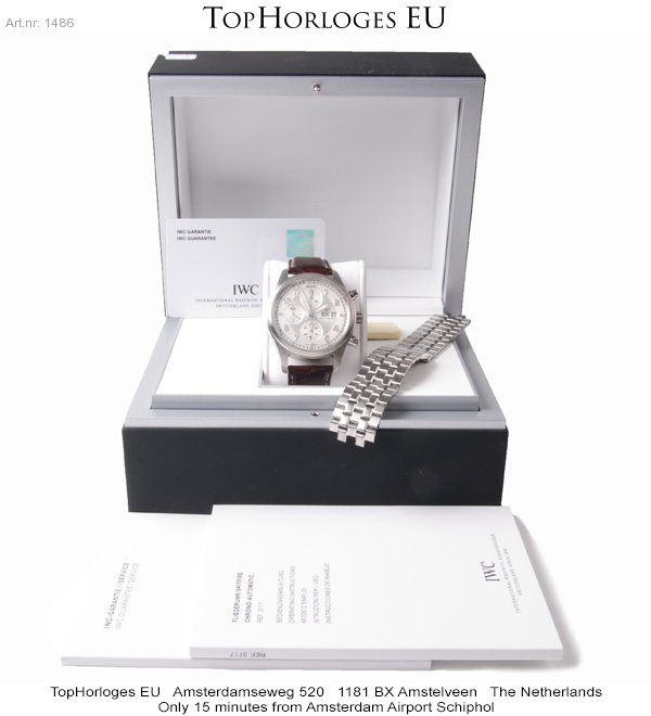 Een zeer mooie occasion IWC fliegeruhr, model spitfire met chronograaf. Geheel compleet met doos en bijbehorende papieren, tevens zit er ook een stalen band bij. (IW371702)