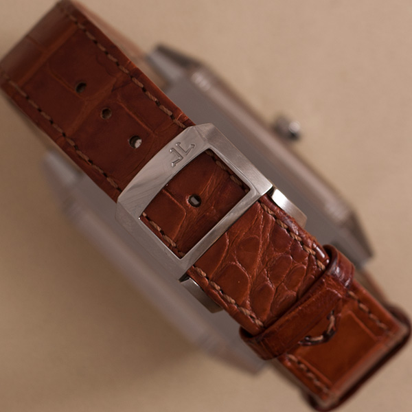 Beautiful Jaeger-LeCoultre Reverso Squadra. Steel with leather strap/folding clasp.