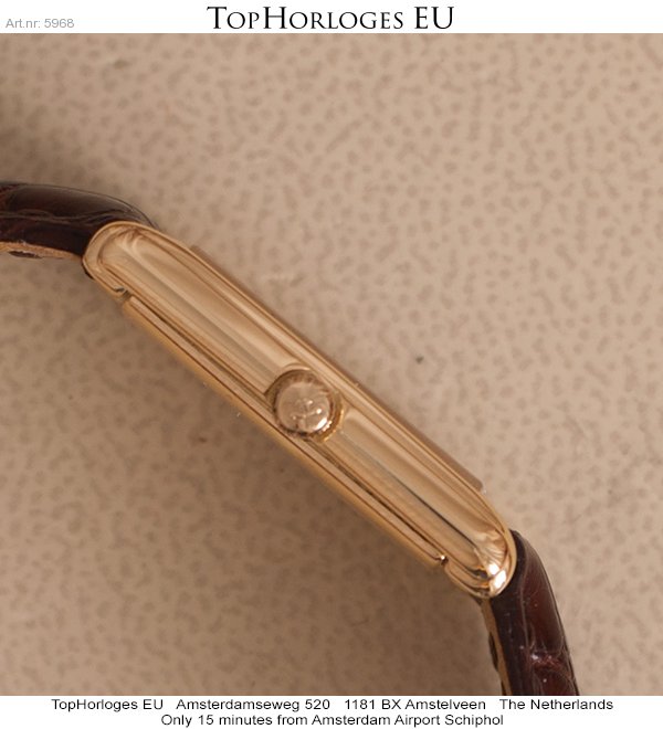 Een mooi klasiek Tank horloge van Jaeger-LeCoultre in het geelgoud met niewe generieke lederen band. Witte wijzerplaat met romeinse cijfers.