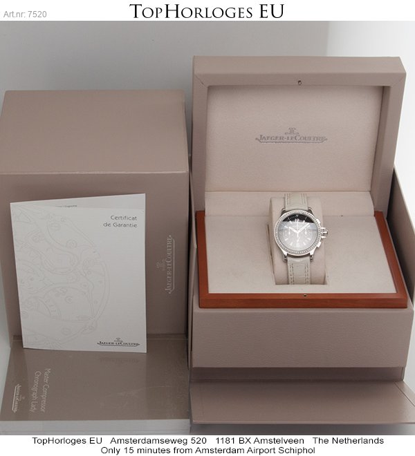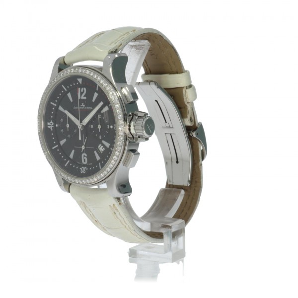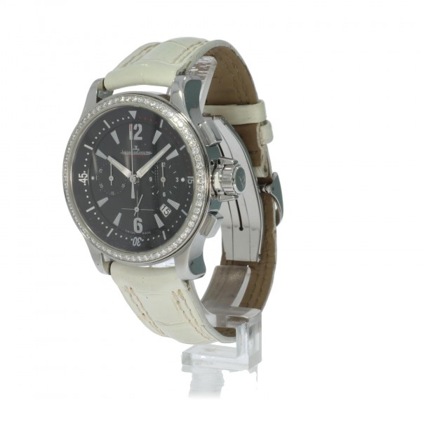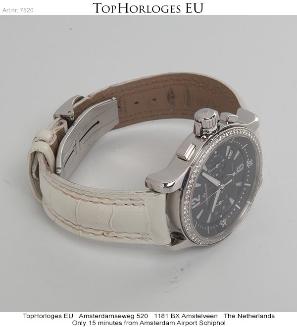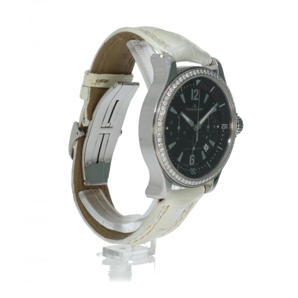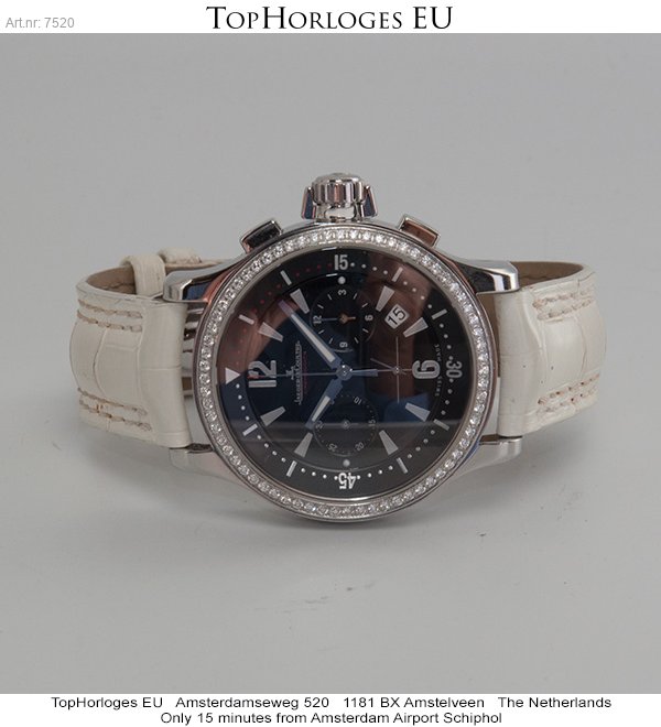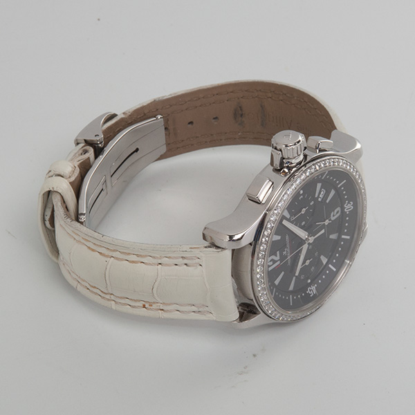 Een mooie complete dames Jaeger-LeCoultre Master Compressor. Deze chronograaf is origineel op de lunette bezet met briljant geslepen diamanten.