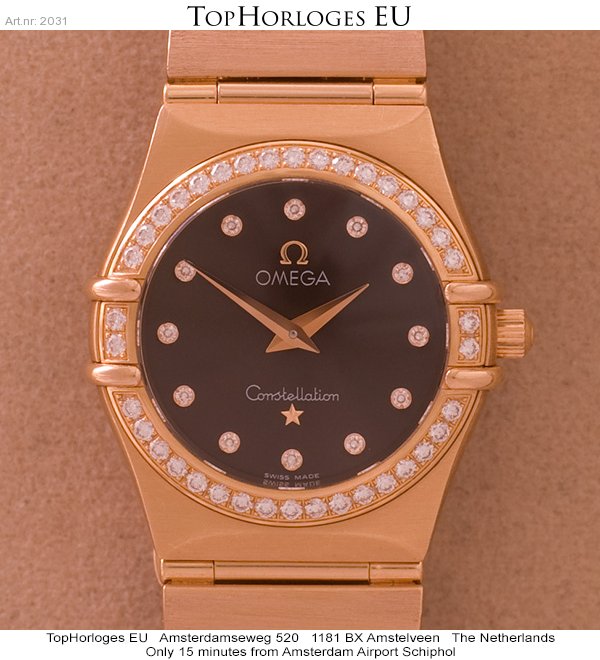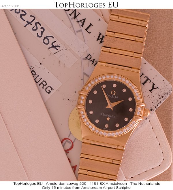 Een zeer weinig gedragen rozegouden Omega Constellation dames horloge. Voorzien van orgineel door de fabriek bezetten lunetten en diamant op de uur aanduidingen.
