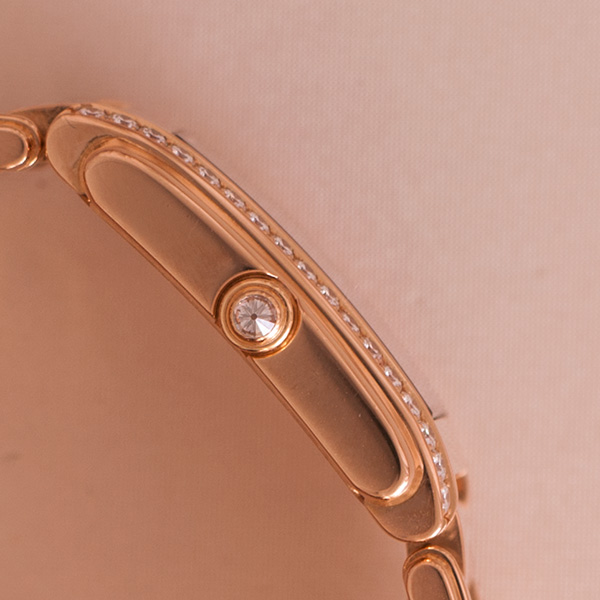 Een zogoed als ongedragen Patek Philippe twenty four in het rozegoud met chocolade bruine wijzerplaat. De lunette en uuraanduidingen zijn voorzien van diamanten.
