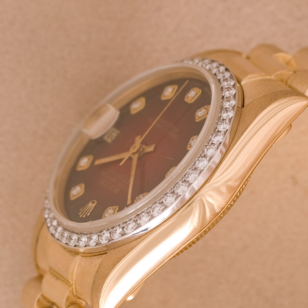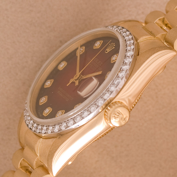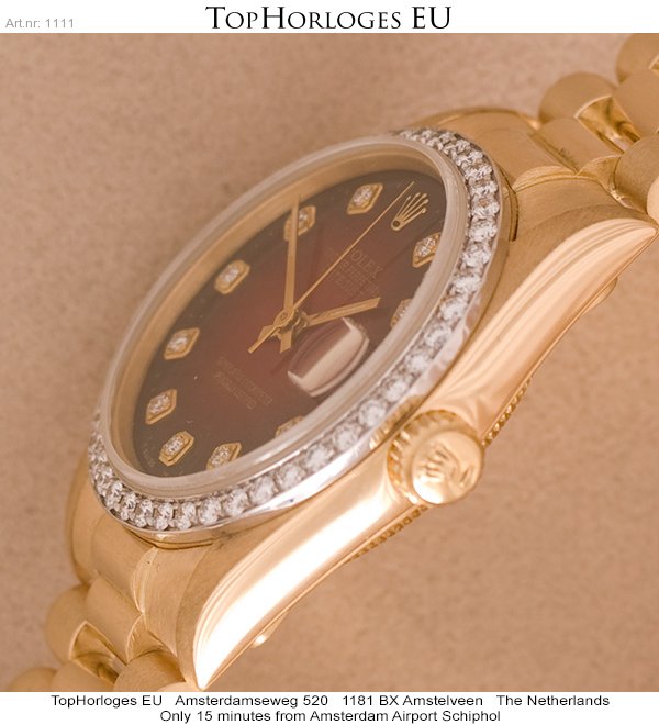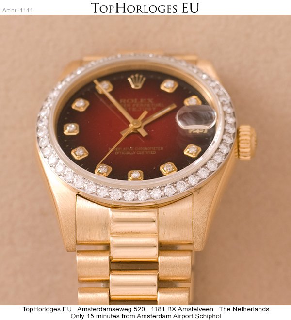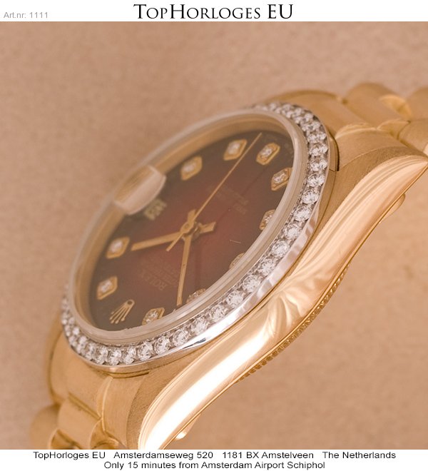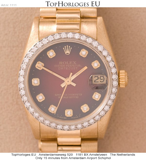 Een zeer weinig gedragen gouden Rolex Datejust Medium. Briljant gezette lunette, en briljant op de uren van de wijzerplaat.