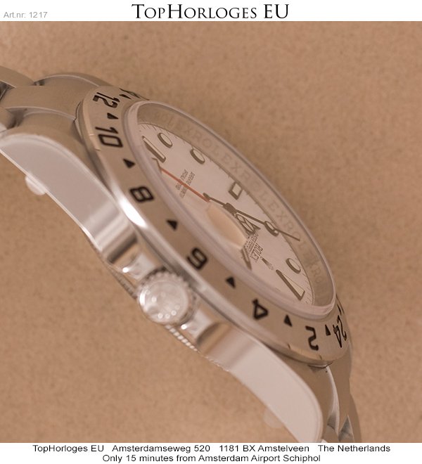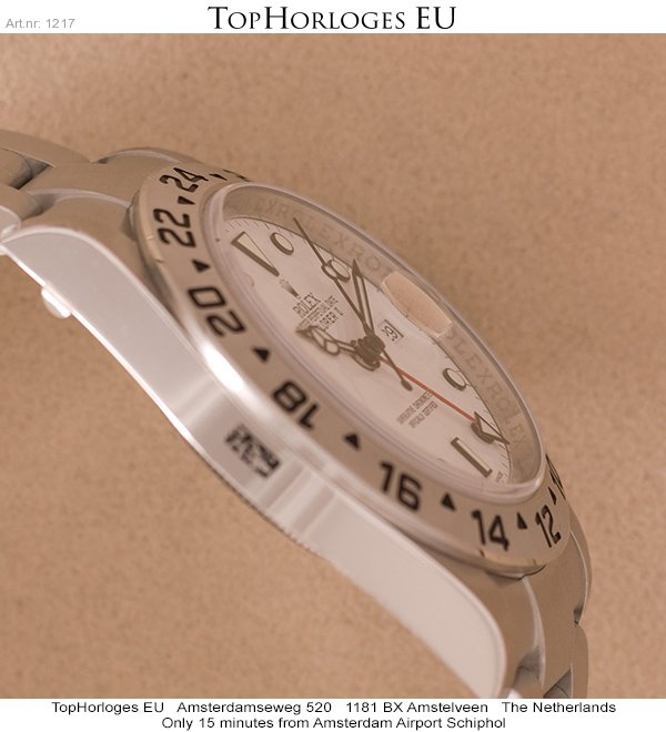 Een nieuwe, ongedragen stalen Rolex Explorer II met witte wijzerplaat.