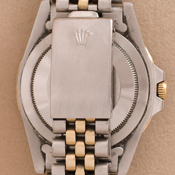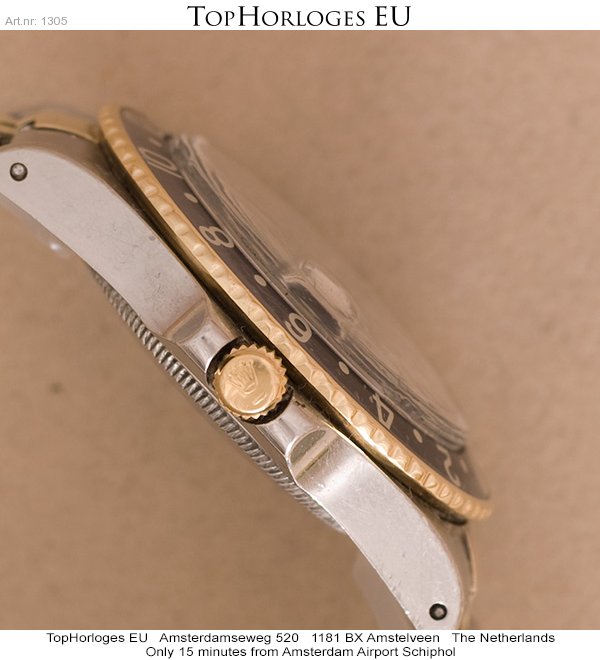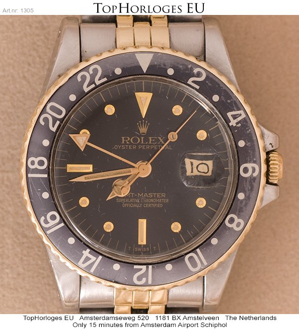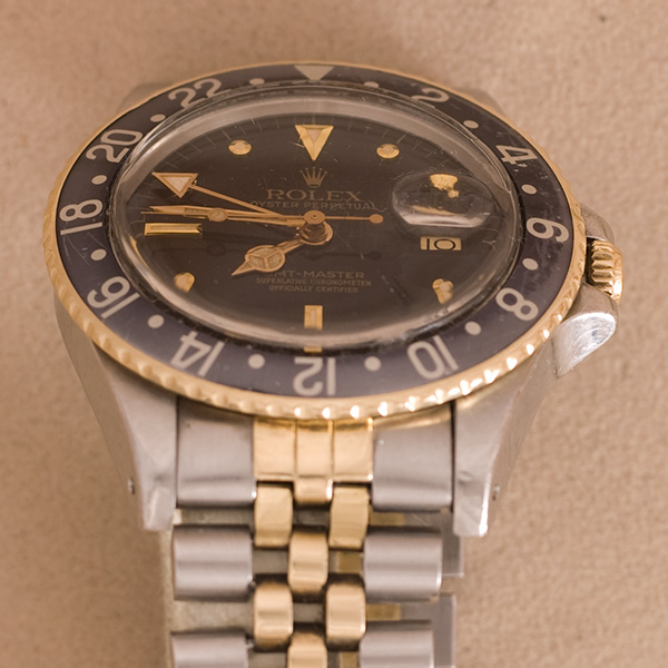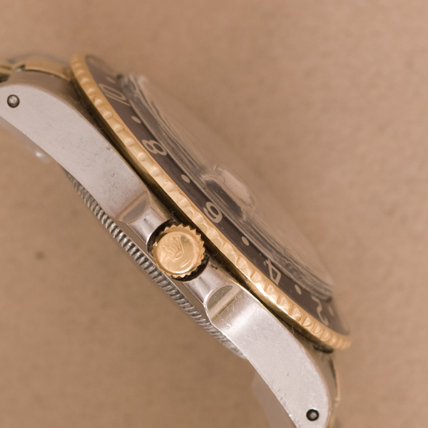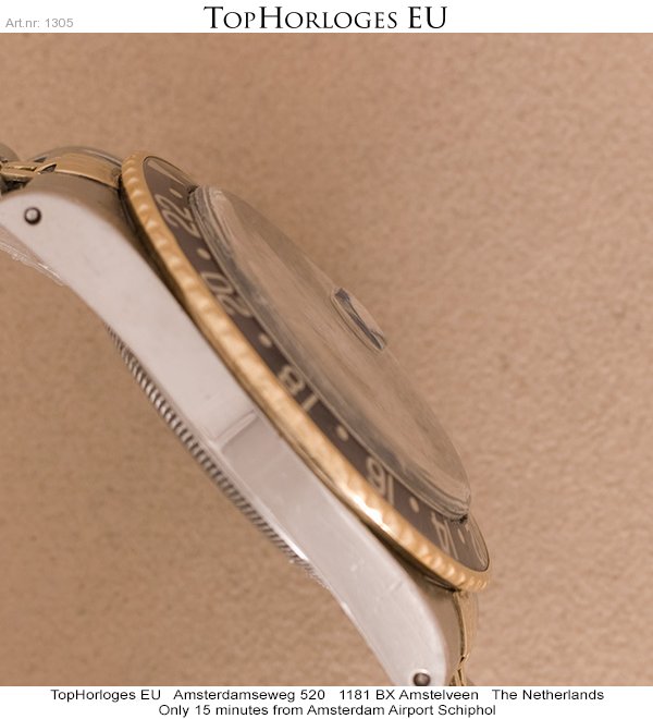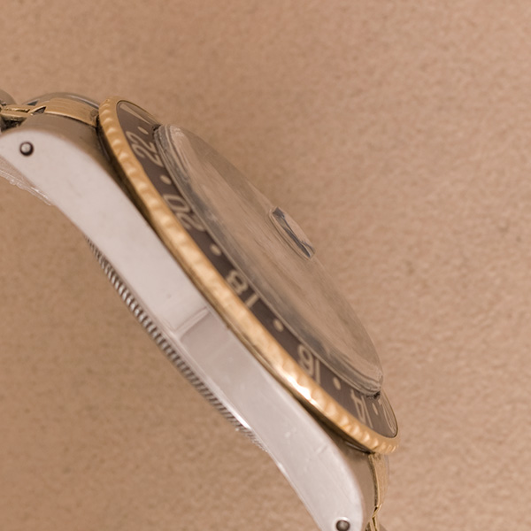 Een gedragen staal met geelgouden GMT Rolex horloge met goud-stalen jubile band. Orginele lunette is mooi verkleurt tot antraciet grijs.