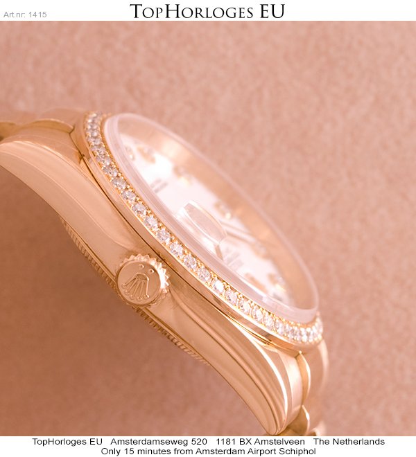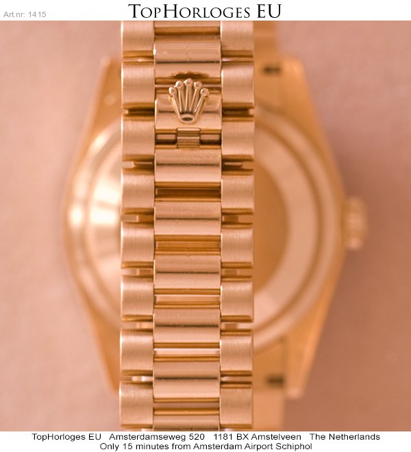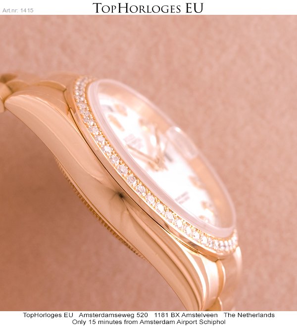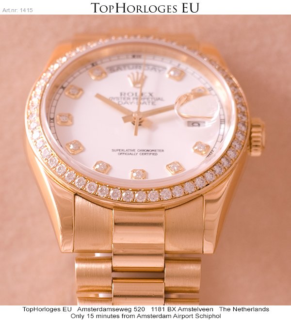 In werkelijke nieuwstaat verkerende geelgouden Rolex Day-Date met president band. Door de fabriek origineel geleverde diamanten lunette en originele wijzerplaat.