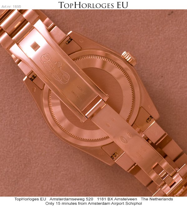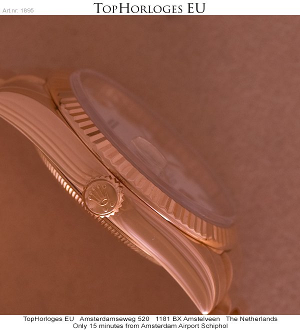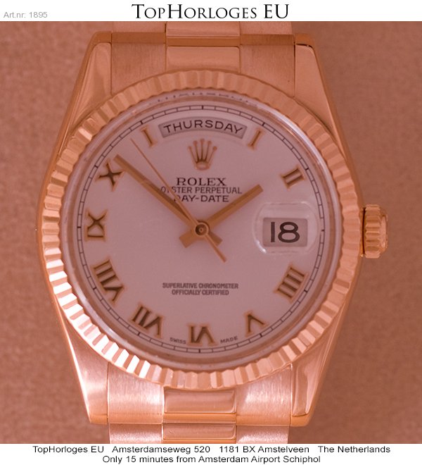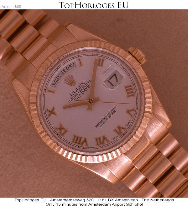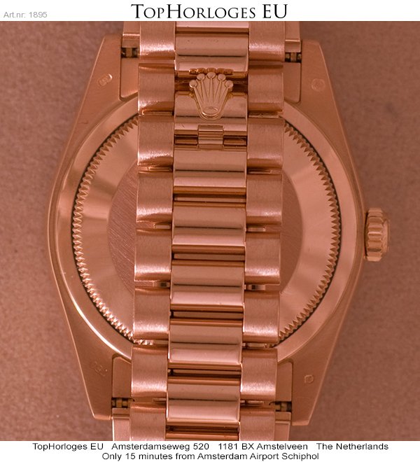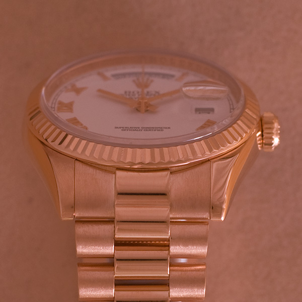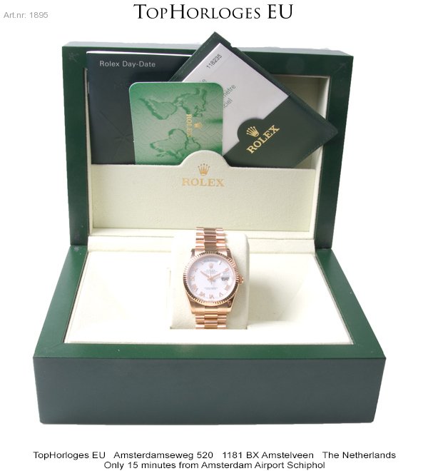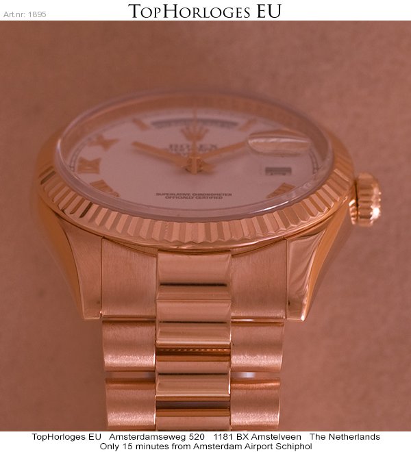 In werkelijke nieuwstaat verkerende rozegouden Rolex Day-Date met president band. Dit horloge is voorzien van een witte wijzerplaat met rozegouden romeinse indexcijfers.